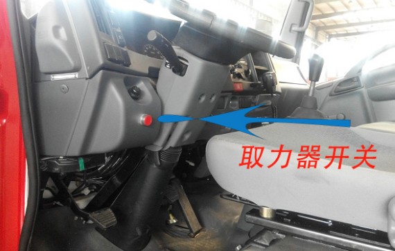 第三步:掛上取力器。取力器開(kāi)關(guān)分油剎和汽剎,(注意在掛取力器的時(shí)候先踩下離合打開(kāi)開(kāi)關(guān),慢慢松離合)具體如下圖: