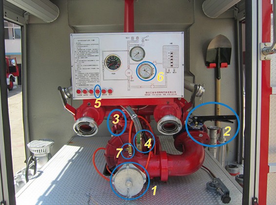 第五步:水加滿后,摘掉取力器,關(guān)閉進(jìn)水閥圖中3的位置,打開(kāi)消防泵排污閥圖中7的位置排真空,拆下吸水管,蓋好蓋子。